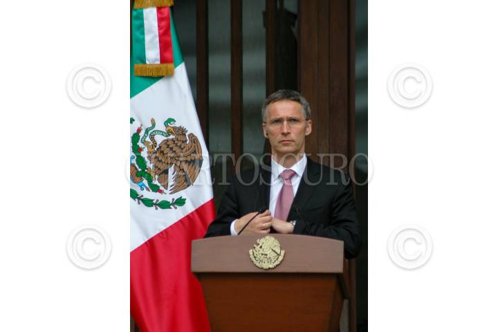 MÉXICO, D.F., 09ABRIL2010.- El primer ministro de Noruega Jens Stoltenberg durante un mensaje que ofreció a los medios de comunicación en las escalinatas de la residencia oficial de Los Pinos. FOTO: RODOLFO ANGULO/CUARTOSCURO.COM