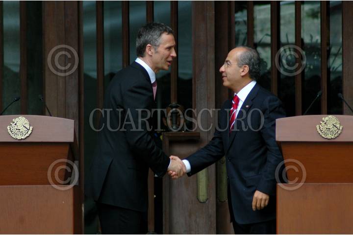 MÉXICO, D.F., 09ABRIL2010.- El primer ministro de Noruega Jens Stoltenberg y el presidente Felipe Calderón al termino de un mensaje que ofrecieron a los medios de comunicación en las escalinatas de la residencia oficial de Los Pinos. FOTO: RODOLFO ANGULO/CUARTOSCURO.COM