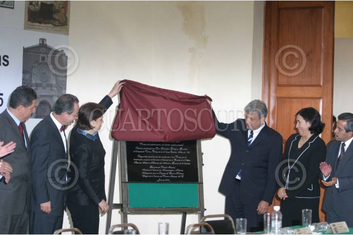 MEXICO, D.F. 14JULIO2005.- Sari Bermudez, Titular del CONACULTA y Andrés Manuel López Obrador, Jefe de Gobierno de la ciudad de México, develan la placa inaugural del Acervo Histórico del Archivo General de Notarias, en el Ex Templo Corpus Christy. FOTO: Nellly Salas/CUARTOSCURO.COM
