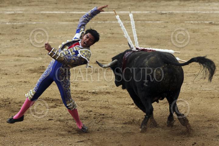 GUADALAJARA, JALISCO 25AGOSTO2013.- El Novillero Alejandro Lima “El Mojito” durante su participación en la segunda novillada en la Plaza de Toros Nuevo Progreso de esta ciudad, mismo que fue embestido por un toro durante su acto. FOTO: FERNANDO CARRANZA GARCÍA /CUARTOSCURO.COM