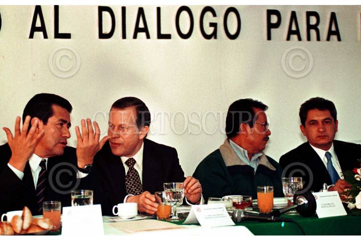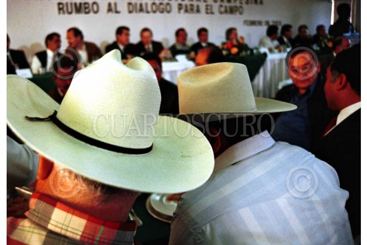 La Confederación Nacional Campesina (CNC), realizó hoy una reunión para determinar su posición en las negociaciones que habrán de llevarse a cabo entre campesinos con el Gobierno federal. En la imagen, Diódoro Carrasco y Manuél Angel Nuñez Soto platican, representante de la CNC y gobernador de Hidalgo, mientras Heladio Ramírez y Tomás Yarrington, dirigente de esa organización y gobernador de Tamaulipas. FOTO: Juan Pablo Zamora/CUARTOSCURO.COM