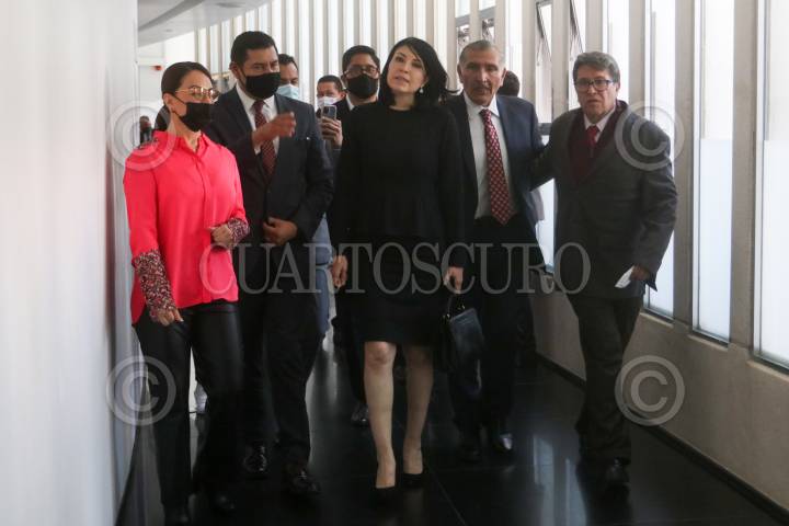 Nuvia Magdalena Mayorga Delgado, secretaria de la Comisión de Crédito y Hacienda Público; Alejandro Armenta Mier, presidente de la comisión de Hacienda y Crédito Público; Victoria Rodríguez Ceja, aspirante a integrante del Gobierno de México; Adán Augusto López, secretario de Gobernación, y Ricardo Monreal, coordinador parlamentario de Morena en el Senado, durante su llegada a la comparecencia de la aspirante en el Senado de la República