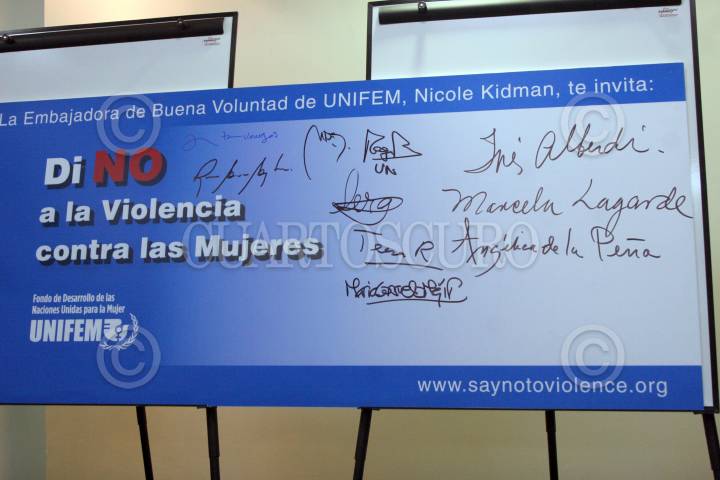 México D.F., a 31 de Julio de 2008.- Cartel de la campaña "Di No a la Violencia contra las Mujeres", con las firmas de las personalidades que asistieron a la presentación. FOTO: VICTORIA VALTIERRA/CUARTOSCURO.COM