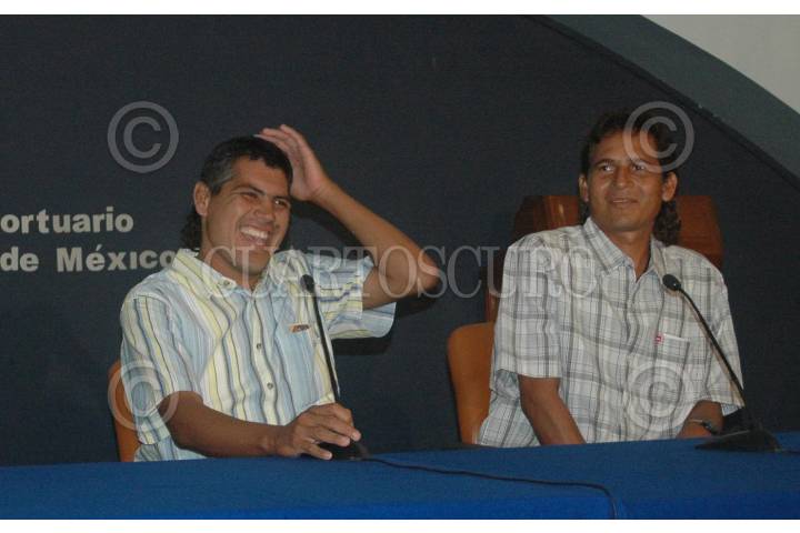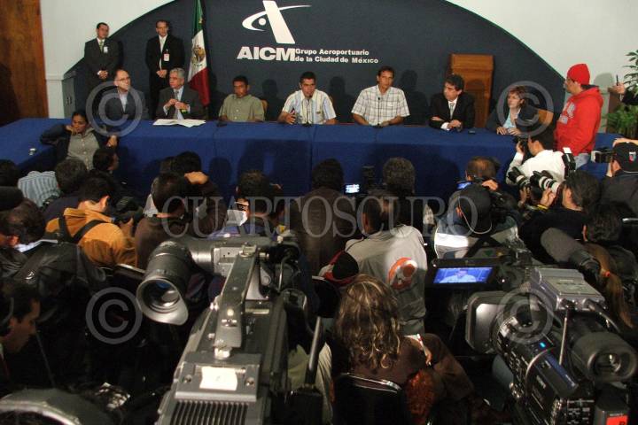 MEXICO, D.F., 25AGOSTO2006.- Jesús Eduardo Vidaña y Salvador Ordoñez, dos de los naufragos que lograron sobrevivir 9 meses en altamar, llegaron a la capital y ofrecieron una conferencia en el Aeropuerto Internacional de la Ciudad de México. FOTO: Saúl López/CUARTOSCURO.COM