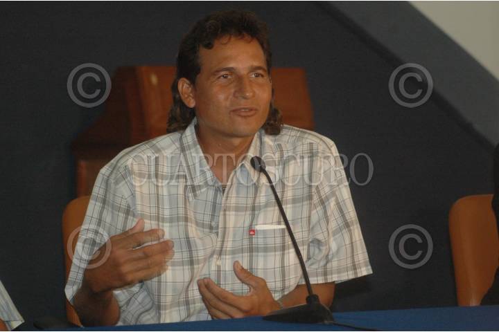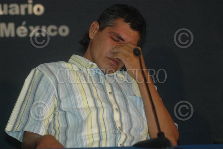 MEXICO, D.F., 25AGOSTO2006.- Salvador Ordoñez, uno de los tres pescadores que naufragaron durante nueve meses, por fin llegaron a la capital y ofrecieron una conferencia de prensa en el Aeropuerto Internacional de la Ciudad de México. FOTO: Saúl López/CUARTOSCURO.COM