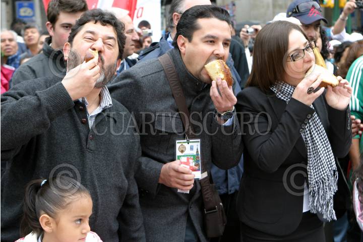 MÉXICO, D.F., 03ENERO2010.- Laura Velazquez, secretaria de Desarrollo Económico, acompañada de Antonio Arias Ordoñez de la Cámara Nacional de la Industria Panificadora y Jesús Viveros de la empresa Lala durante el corte de la monumental Rosca de Reyes Bicentenario que rompió el record Guinness como la rosca de mayor peso y porciones que rodeo completamente el Zócalo capitalino. FOTO: RODOLFO ANGULO/CUARTOSCURO.COM