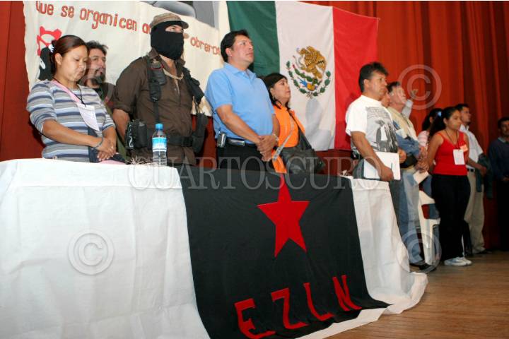 MÉXICO D.F. 29ABRIL2006.- María Luisa Martínez (Izquierda), viuda del minero Jose Alfredo Ordoñez, muerto en la tragedia de la mina Pasta de Conchos, el Subcomandante Insurgente Marcos, Delegado Zero del EZLN, Jesus Torres Nuño lider sindical de Euzcadi, durante el Primer Encuentro Nacional Obrero, donde se reuniéron con miembros de diversos sindicatos y simpatizantes con el movimiento. FOTO: Guillermo Perea/CUARTOSCURO.COM