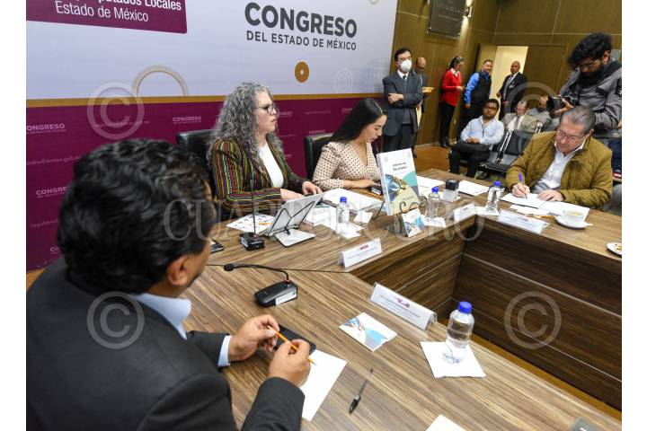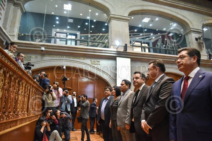 TOLUCA, ESTADO DE MÉXICO, 30ABRIL2025.- Óscar Flores Jiménez, Secretario de Finanzas del Estado de México entregó la Cuenta Pública del Gobierno, Organismos Auxiliares y Autónomos del Estado de México 2024 a integrantes de la LXII Legislatura Local, acompañado por José Francisco Vázquez, Presidente de la Junta de Coordinación Política, Maurilio Hernández, Presidente de la Mesa Directiva, Liliana Dávalos Ham, titular del Órgano Superior de Fiscalización del Estado de México. FOTO: CRISANTA ESPINOSA AGUILAR /CUARTOSCURO.COM