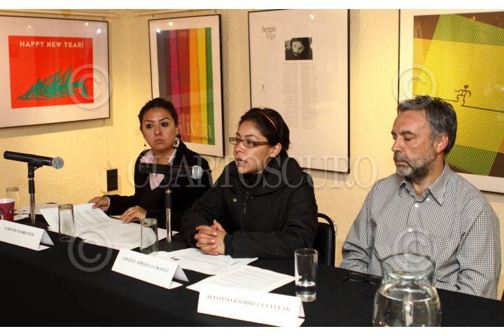 MÉXICO, D.F., 26ENERO2011.- Yuritzin Flores Puig, Angely Amezcua Chavez y Alfonso Ramírez Cuellar durante una conferencia de prensa de Oxfam y El Barzón en donde dieron a conocer avances del programa de uso sustentable de agua y energia en la agricultura. FOTO: RODOLFO ANGULO/CUARTOSCURO.COM
