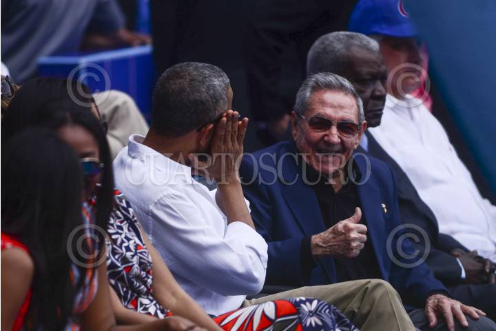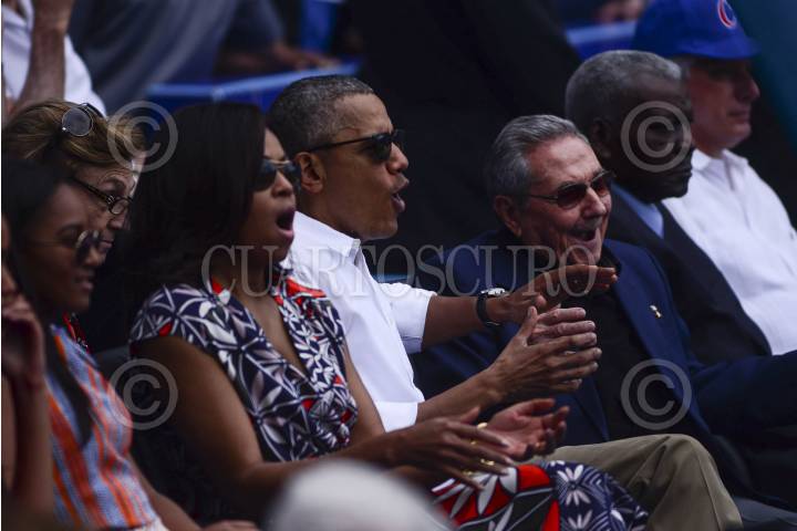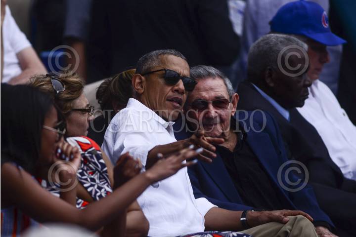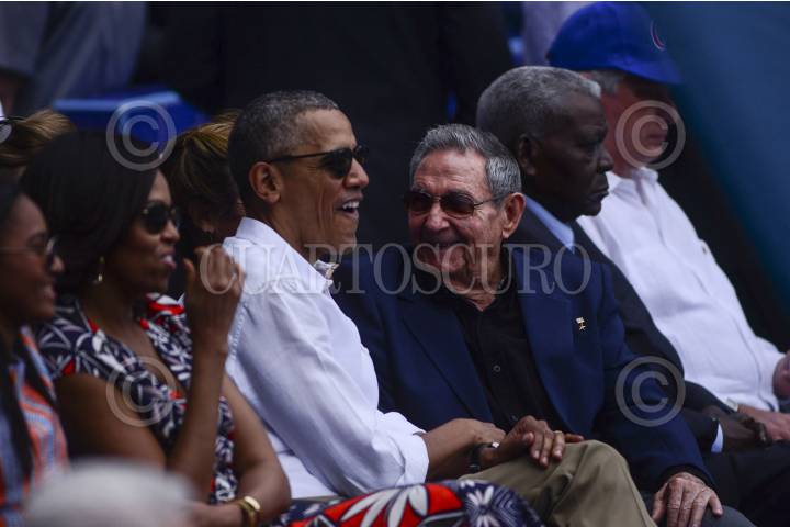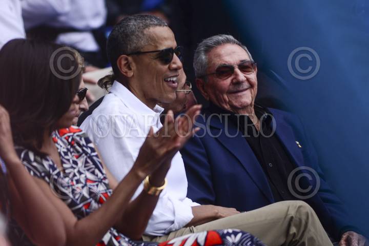 LA HABANA, CUBA, 22MARZO2016.- Barack Obama, presidente de los Estados Unidos y Raúl Castro, presidente de Cuba, durante el partido de béisbol entre los Rays Tampabay y la selección de Cuba, como parte de las actividades para restablecer las actividades diplomáticas entre la isla y los norteamericanos. FOTO: ADOLFO VLADIMIR /CUARTOSCURO.COM