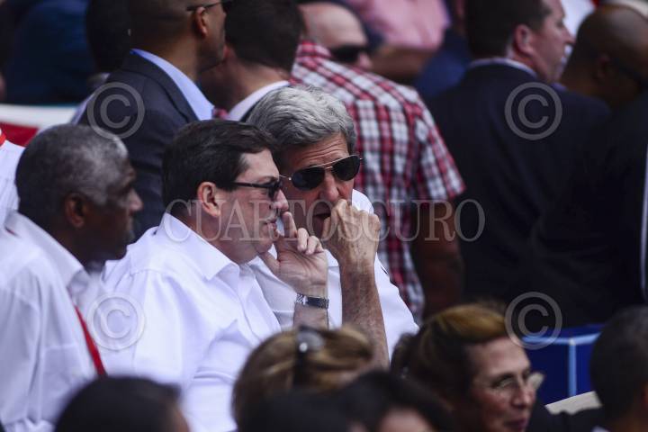 LA HABANA, CUBA, 22MARZO2016.- Bruno Rodríguez Parrilla, ministro de Relaciones Exteriores de Cuba y John Kerry, Secretario de Estado de EE.UU., durante el partido de béisbol entre los Rays Tampabay y la selección de Cuba, como parte de las actividades para restablecer las actividades diplomáticas entre la isla y los norteamericanos. FOTO: ADOLFO VLADIMIR /CUARTOSCURO.COM