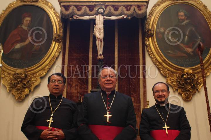 PEUBLA, PUEBLA, 24FEBRERO2011.- El arzobispo monseñor Víctor Sánchez Espinosa, presentó ante los medios de comunicación a los nuevos obispos auxiliares de Puebla Dagoberto Sosa Arriaga (izquierda) y Eugenio Lira Rugarcía (derecha) designados por el Papa Benedicto XVI, en la que atenderán las necesidades de la diocesis y la de los fieles católicos. FOTO: FRANCISCO GUASCO/CUARTOSCURO.COM