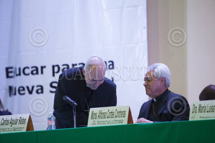 MÉXICO, D.F 11SEPTIEMBRE2012.- La Conferencia del Episcopado Mexicano, encabezado por Carlos Aguiar Retes, arzobispo de Tlalnepantla y presidente de esta conferencia, y por Alfonso Cortés, obispo de Cuernavaca y presidente de la Dimensión Pastoral Educativa, se pronunciaron por una reforma educativa, la cual consideran, es urgente y en donde la labor del “sindicato” ha propiciado corrupción y malos manejos en el sistema educativo. En su carta pastoral y en el foro “Educar para una nueva sociedad” se destaca que al libro de texto gratuito se precisa que como sociedad se debe participar para que los contenidos de programas y libros de texto puedan reflejar “no una ideología parcial y tendenciosa sino una verdadera propuesta educativa. FOTO: JUAN PABLO ZAMORA /CUARTOSCURO.COM