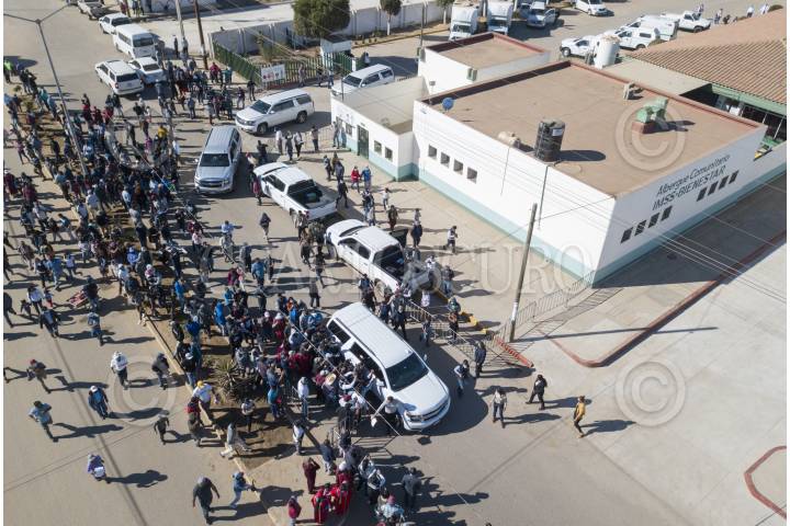 Ciudadanos se aglomeran en la camioneta que traslada al Presidente de México, Andrés Manuel López Obrador durante la salida del evento realizado en el IMSS en San Quintín