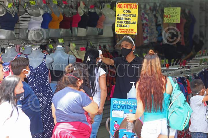 Un Joven de un establecimiento ubicado en el corredor comercial de la zona de Obregón, toma la temperatura a un cliente, esto a tres días de la reactivación económica en Jalisco y después un largo periodo de confinamiento por la pandemia sanitaria del coronavirus (Covid-19).