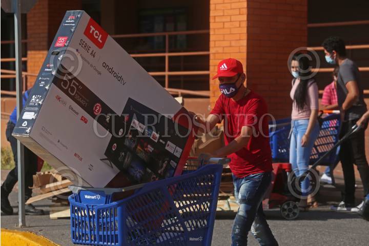 Un hombre sale de un supermercado de cadena nacional después de aprovechar las ofertas del buen fin y adquirir una pantalla de 55”.