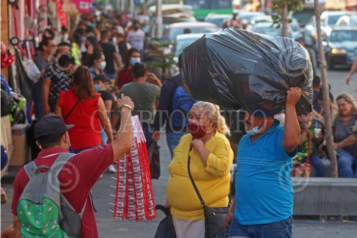 Un grupo de personas caminan por el corredor comercial de la zona de Obregón, esto a tres días de la reactivación económica en Jalisco, después un largo periodo de confinamiento por la pandemia sanitaria del coronavirus (Covid-19).