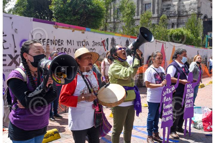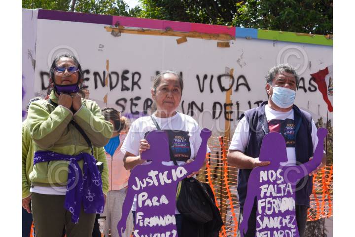 María Magdalena Velarde, madre de Fernanda Sánchez Velarde, víctima de feminicidio en el año 2014 acompañada por familiares de víctimas de feminicidio y del Observatorio Ciudadano Nacional del Feminicidio exigiendo justicia en el feminicidio de la joven de 18 años y sentencia vitalicia para el presunto feminicida.
