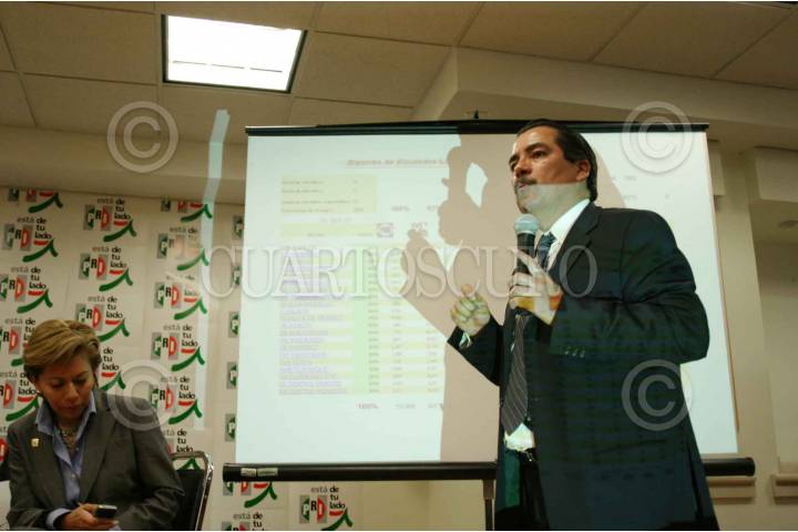 Rafaél Oceguera, enviado del cómite ejecutivo nacional del PRI, explicò en conferencia de prensa el supuesto fraude cibernético del que fueron objeto en las elecciones de Tabasco. FOTO: Moisés Pablo/CUARTOSCURO.COM