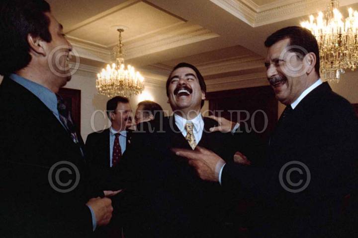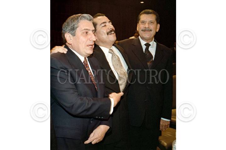 El senador Cristóbal Arias (del PRD), Rafael Oceguera y Enrique Jackson diputados (del PRI) conversan antes de la llegada del presidente Ernesto Zedillo, quien recibió un informe del inicio del periodo de la comisión permanente.