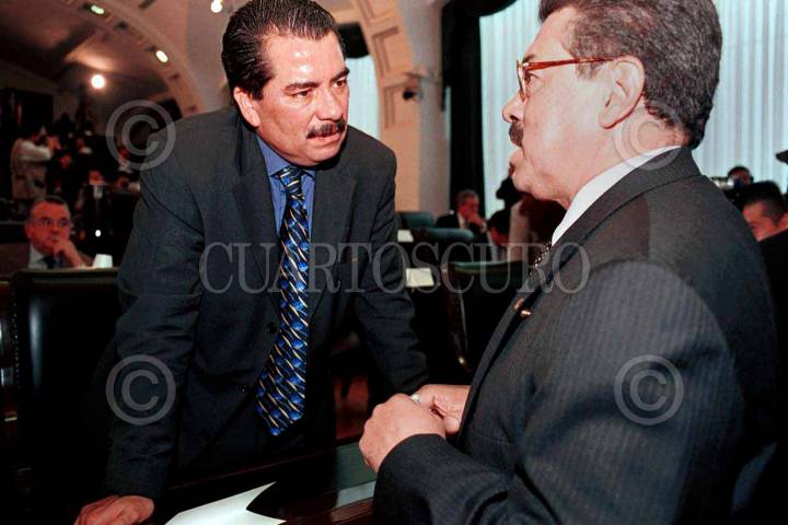 Los legisladores priístas Rafael Oceguera y Edurado Andrade, conversan antes de iniciar los trabajos de la comisión permanente del congreso de la unión. FOTO: David García/CUARTOSCURO.COM
