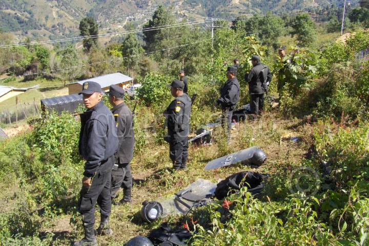 GUERRERO.-10NOVIEMBRE2005.- Elementos de la policia del estado, vigilan constantemente la comunidad de El Capulin municipio de Tlacoapa ante cualquier contigencia que pudiera presentarse, debido al conflicto agrario que mantienen con la comunidad de Moyotepec municipio de Ocoapa, quienes en dias pasados destruyeron mas de 49 casas durante el desalojo violento que llevaron a cabo contra dicha comunidad, por la pelea de 456 hectareas. FOTO: Oscar Alvarado/CUARTOSCURO.COM