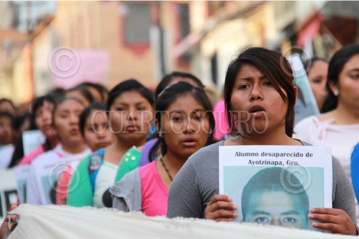 CUERNAVACA, MORELOS, 26ENERO2014.- A cuatro meses de la desaparición de 43 estudiantes de la Escuela Normal Rural de Ayotzinapa, Guerrero, alrededor de 400 morelenses marcharon por las principales calles del centro de la capital para exigir la aparición con vida de los normalistas. Se tuvo una participación destacada de estudiantes de la Escuela Normal "General Emiliano Zapata" de Amilcingo, Morelos. FOTO: PATRICIA MORALES / CUARTOSCURO.COM
