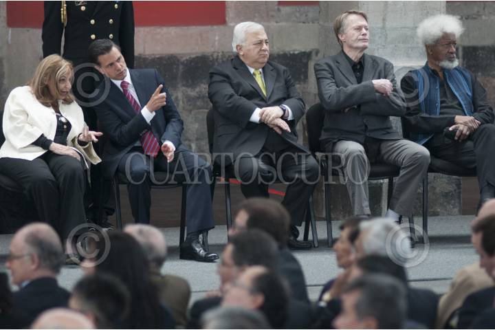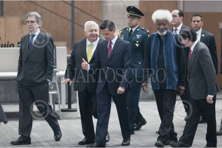MÉXICO, DF., 31MARZO2014.- MRafael Tovar y de Teresa, director del CONACULTA; Enrique Peña Nieto, presidente de México; Emilio Chuayffet; Secretario de Educación Pública; y Wole Soyinka, premio nobel de literatura en 1986; participaron en el homenaje conmemorativo al centenario del natalicio de Octavio Paz en la biblioteca México "José Vasconelos". FOTO: IVÁN STEPHENS /CUARTOSCURO.COM