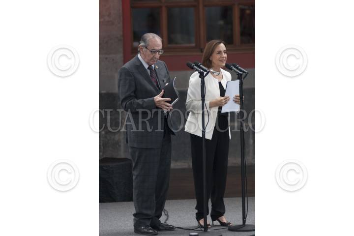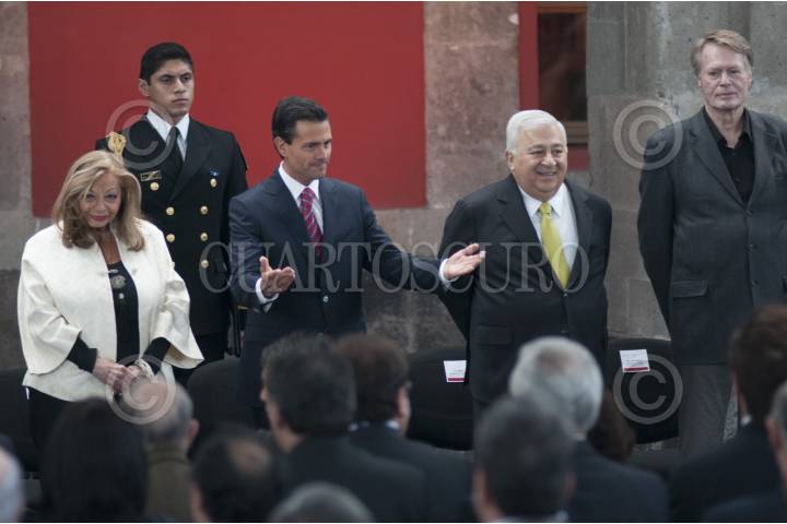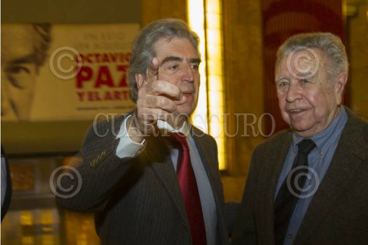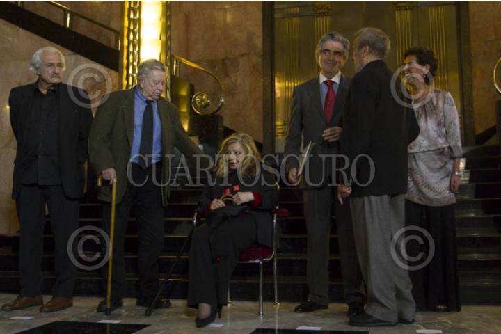 MÉXICO, D.F., 10SEPTIEMBRE2014.- Rafael Tovar y de Teresa, Presidente de Conaculta, encabezo la inauguración de la exposición “En esto ver aquello. Octavio Paz y el arte” en el Palacio de Bellas Artes. Durante la ceremonia fue acompañado del pintor Manuel Felguérez, Marie Jo Paz (viuda de Octavio Paz) María Cristina García Cepeda, directora del Instituto Nacional de Bellas Artes, Vicente Rojo Almazán es un pintor y escultor. FOTO: GUILLERMO PEREA /CUARTOSCURO.COM