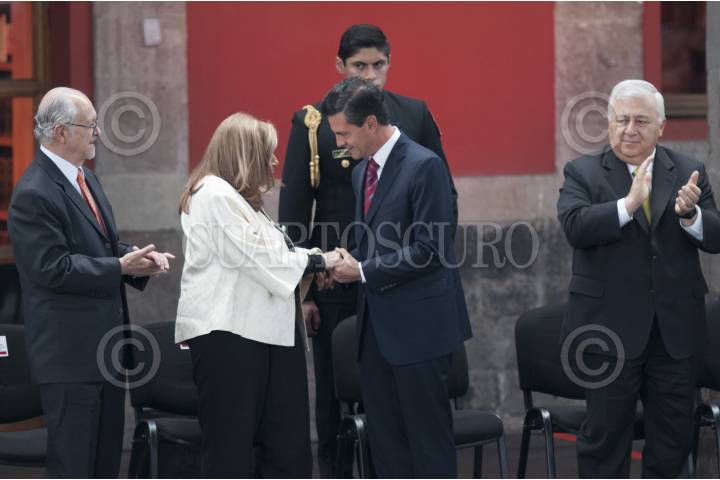 MÉXICO, DF., 31MARZO2014.- Mario Molina, premio nobel de Química; Marie Jo Paz, viuda de Octavio Paz; Enrique Peña Nieto, presidente de México; Emilio Chuayffet; Secretario de Educación Pública; y Jean-Marie Gustave Le Clézio, premio nobel de literatura; participaron en el homenaje conmemorativo al centenario del natalicio de Octavio Paz en la biblioteca México "José Vasconelos". FOTO: IVÁN STEPHENS /CUARTOSCURO.COM