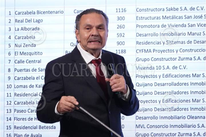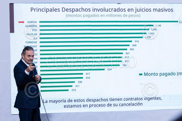 CIUDAD DE MÉXICO, 27ENERO2025.- Octavio Romero Oropeza, director del Infonavit, muestras una lista de despacho que se dedicaban a entablar juicios masivos contra personas que tenían retraso en el pago de sus créditos de Infonavit y posteriormente despojarlas de su vivienda para después rematarlas. El funcionario recordó que en la época de Andrés Manuel López Obrador canceló estos procedimientos, sin embargo, señaló que bajo el amparo de funcionarios del propio instituto se implementaron juicios individuales. Durante su presentación destacó a Grupo Acser, despacio que actualmente ha desaparecido sin dejar rastro, que en su momento tuvo favores de personas dentro del Infonavit para cobrar estos contratos apócrifos. Esto en el marco de la presentación del Plan Nacional de Vivienda durante la mañanera del pueblo. FOTO: MOISÉS PABLO/CUARTOSCURO.COM