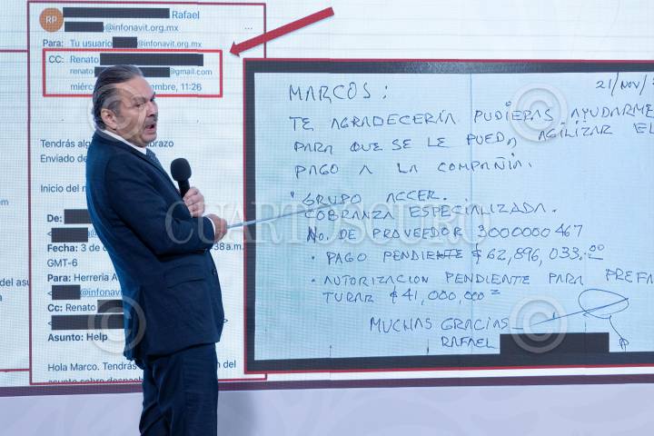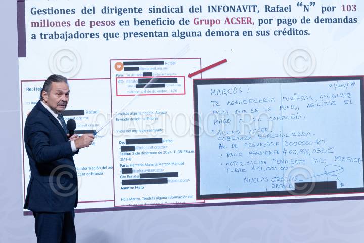 CIUDAD DE MÉXICO, 10ENERO2025.- Octavio Romero Oropeza, director del Infonavit, mostró un audio en el cuál supuestos gestores engañan ala gente con la promesa de tramitar sus ahorros del Infonavit, esto durante la mañanera. FOTO: MOISÉS PABLO/CUARTOSCURO.COM