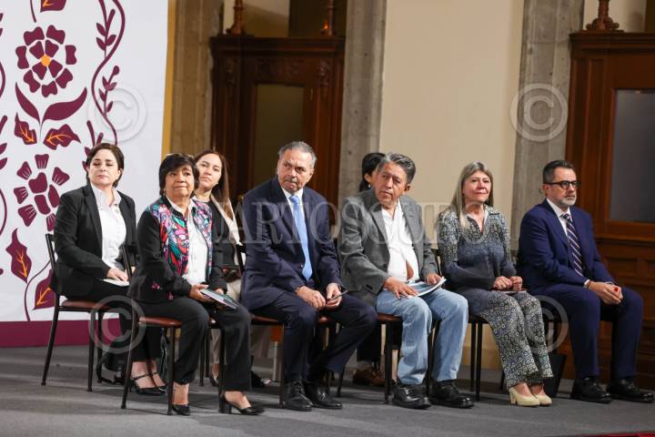 CIUDAD DE MÉXICO, 14ABRIL2025.- Edna Vega Rangel, Octavio Romero Oropeza, Rodrigo Chávez Contreras, Rocio Mejía Flores, e Iván Escalante, durante la mañanera del pueblo, en la cual anuncio que se amplio en cien mil viviendas la meta de un millón que se tenía programada por parte del Programa Nacional de Vivienda. FOTO: MOISÉS PABLO/CUARTOSCURO.COM