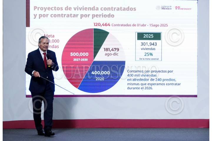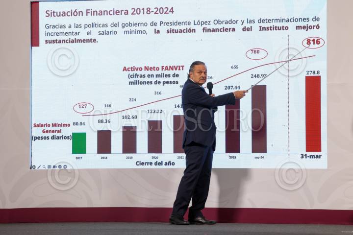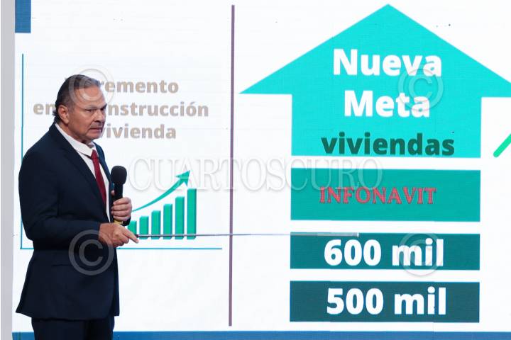 CIUDAD DE MÉXICO, 14ABRIL2025.- Octavio Romero Oropeza, director del Infonavit, muestra una lámina en el que afirma que la situación financiera de este instituto ha mejorado en este sexenio, de tal forma que permitirán aumentar en cien mil viviendas la meta de un millón que tenía perfilada el Programa Nacional de Vivienda. FOTO: MOISÉS PABLO/CUARTOSCURO.COM