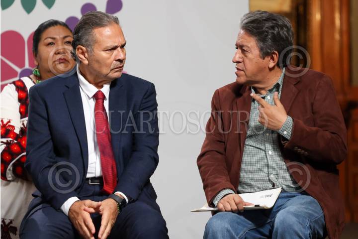 CIUDAD DE MÉXICO, 14JULIO2025.- Octavio Romero Oropeza, director del Infonavit, y Rodrigo Chávez Contreras, titular de la Conavi, son dos de los encargados del Programa Nacional de Vivienda que tiene como objetivo construir 1, 2000 viviendas de interés social durante el sexenio de Claudia Sheinbaum, conversan durante la Mañanera del Pueblo. FOTO: MOISES PABLO/CUARTOSCURO.COM
