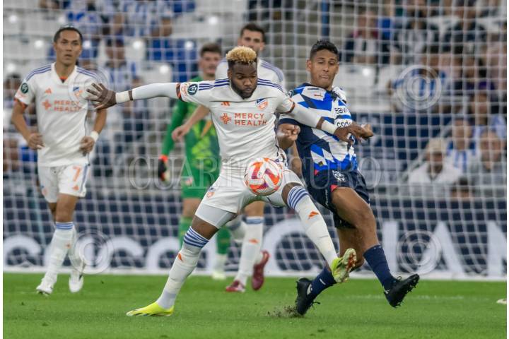 GUADALUPE, NUEVO LEÓN, 14MARZO2024.- Maximiliano Meza de los Rayados del Monterrey, se disputa el balón con Aaron Boupendza de Cincinati FC, en el estadio BBVA., partido correspondiente a la vuelta en octavos de final de la CONCACAF Copa de Campeones 2024 Marcador Global: Monterrey: 3 - Cincinati: 1. FOTO: CUARTOSCURO.COM