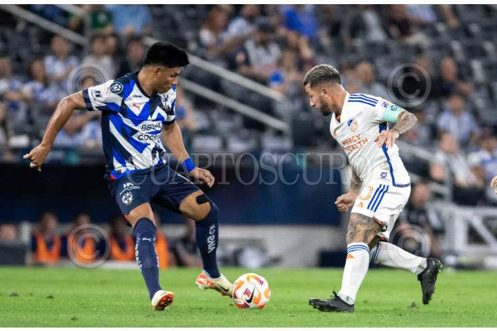 GUADALUPE, NUEVO LEÓN, 14MARZO2024.- Luis Romo de los Rayados del Monterrey, se disputa el balón con Luciano Acosta de Cincinati FC, en el estadio BBVA., partido correspondiente a la vuelta en octavos de final de la CONCACAF Copa de Campeones 2024 Marcador Global: Monterrey: 3 - Cincinati: 1. FOTO: CUARTOSCURO.COM