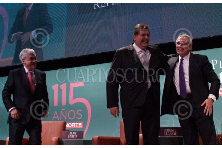 CIUDAD DE MÉXICO, 17ABRIL2019.- El expresidente de Perú, Alan García, falleció hoy tras haberse disparado en la cabeza cuando policías llegaron a su casa para detenerlo como parte de las investigaciones por el caso de corrupción y sobornos de la constructora brasileña Odebrecht. El actual mandatario de Perú, Martín Vizcarra, confirmó el deceso. En la imagen, el expresidente de México Ernesto Zedillo y el presidente de Chile, Sebastián Piñera, acompañan a Alan García. FOTO: ARCHIVO/ GUILLERMO PEREA/ CUARTOSCURO.COM