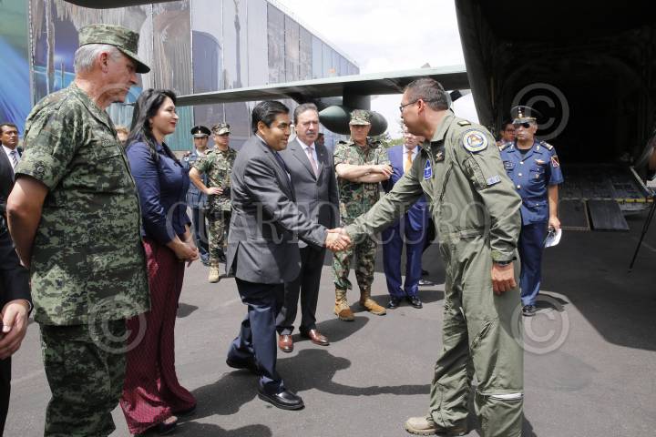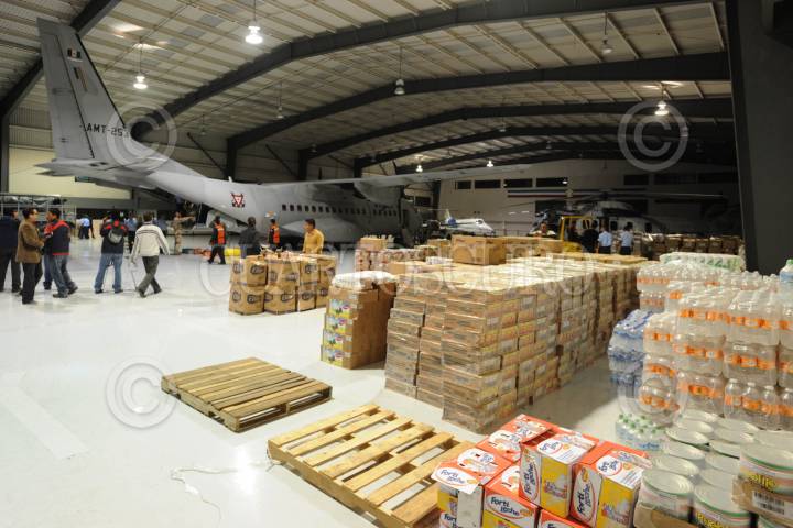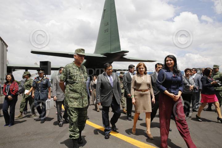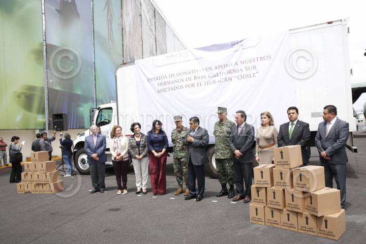 MÉXICO, D.F., 22SEPTIEMBRE2014.- Miguel Barbosa, presidente del Senado, Emilio Gamboa, presidente de la Junta de Coordinación Política del Senado, los senadores Arely Gómez y Gerardo Flores, participaron en la ceremonia de entrega de la donación de víveres para los damnificados por el huracán "Odile". El general Salvador Cienfuegos, Secretario de la Defensa Nacional, el almirante Vidal Francisco Soberón, Secretario de Marina y Laura Vargas, directora del Sistema Nacional DIF, recibieron la donación en la instalaciones del hangar de la SEDENA. FOTO: CUARTOSCURO.COM