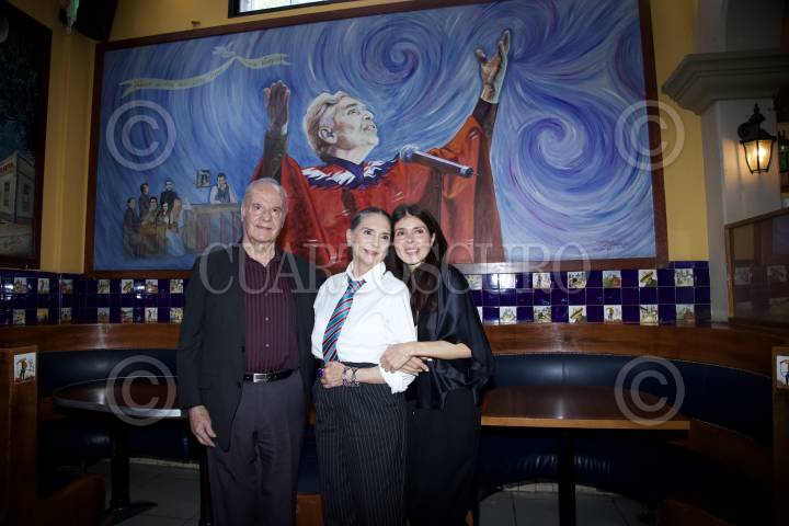 Juan Carlos Allende, Ofelia Medina y Ely Guerra durante la conferencia de prensa del espectáculo Chavela y sus mujeres, homenaje a Chavela Vargas que se realizó en el Salón Tenampa.