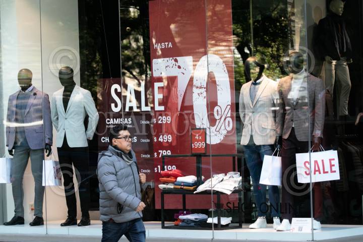 CIUDAD DE MÉXICO, 30DICIEMBRE2023.- Aparador de una tienda de ropa con ofertas de fin de año en Paseo de la Reforma. FOTO: MOISÉS PABLO/CUARTOSCURO.COM