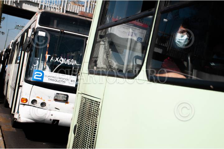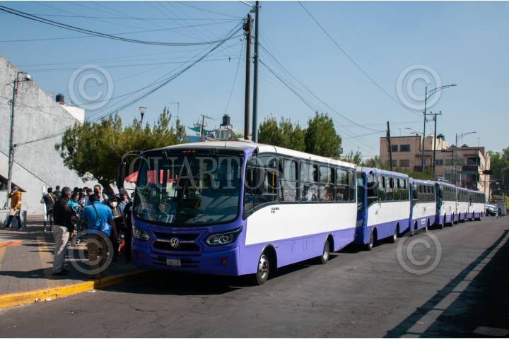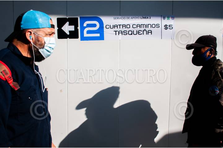 Autobuses RTP hacen fila en la terminal Tasqueña para apoyar a las personas que utilizan la Línea 2 del Metro, la cual corre hasta Cuatro Caminos.