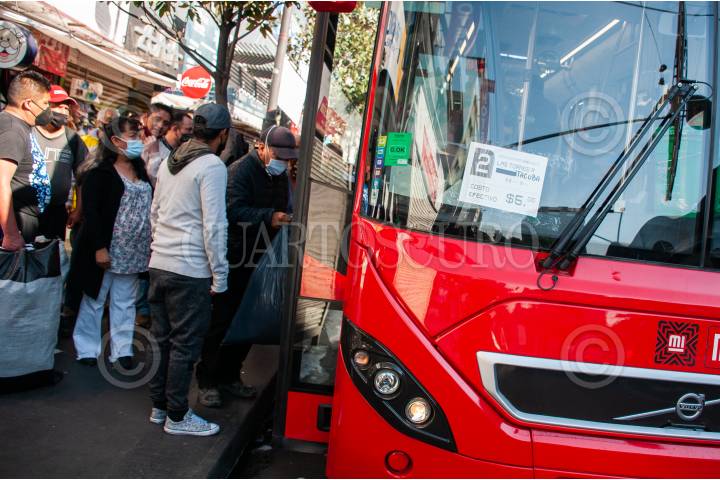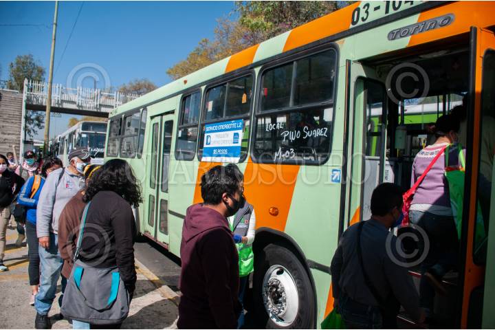 Personas suben al Metrobús con dirección a Tasqueña de la Línea 2 del Metro, como apoyo a los usuarios que utilizan esta ruta del transporte público.