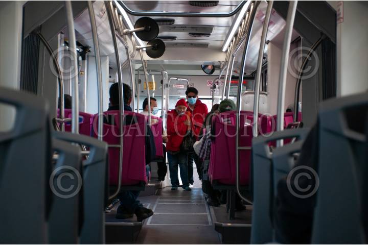 Personas viajan en una unidad del Metrobús, la cual fue implementada para el apoyo a los usuarios que frecuentaban la Línea 2 del Metro, la cual esta fuera de servicio.