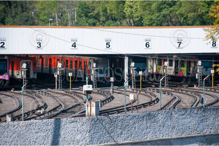 Trenes pertenecientes a la Línea 2 del Metro se encuentran estacionados en la terminal Tasqueña de esta ruta del transporte público.