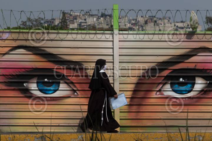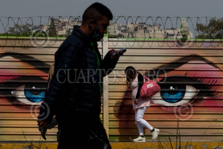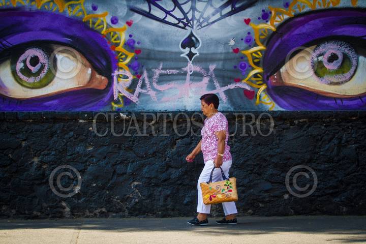 CIUDAD DE MÉXICO, 16MAYO2018.- Una señora camina ante la mirada de un grafiti a la salida del metro Iztapalapa. FOTO: ISAAC ESQUIVEL /CUARTOSCURO.COM