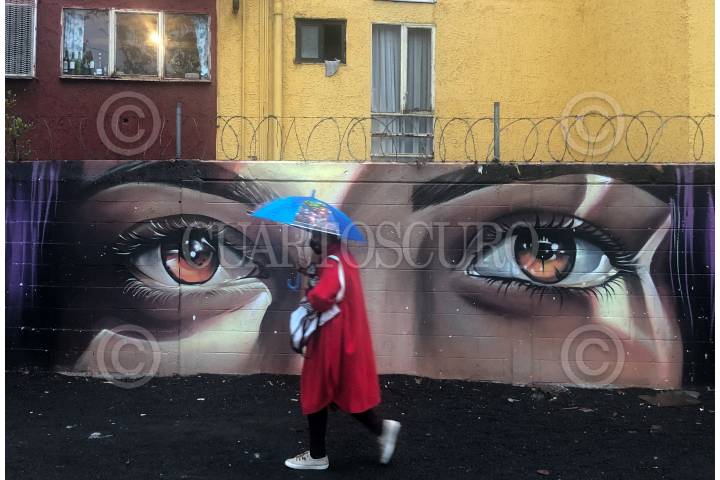 Una mujer camina enfrente de un mural de ojos mientras se cubre de la lluvia con un paraguas, en la alcaldía Iztapalapa