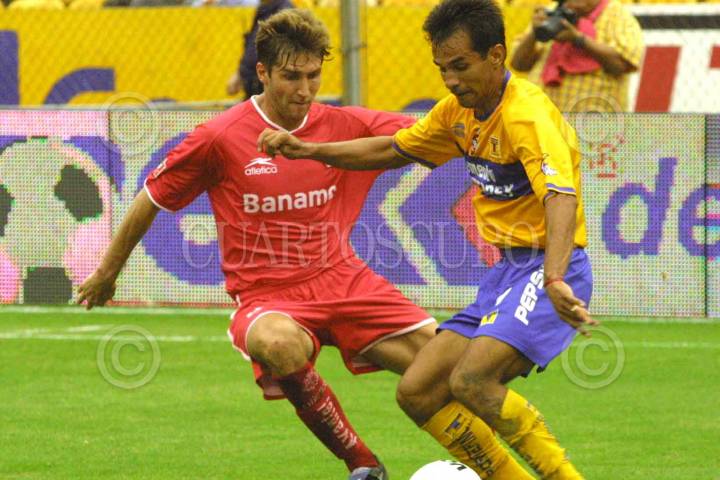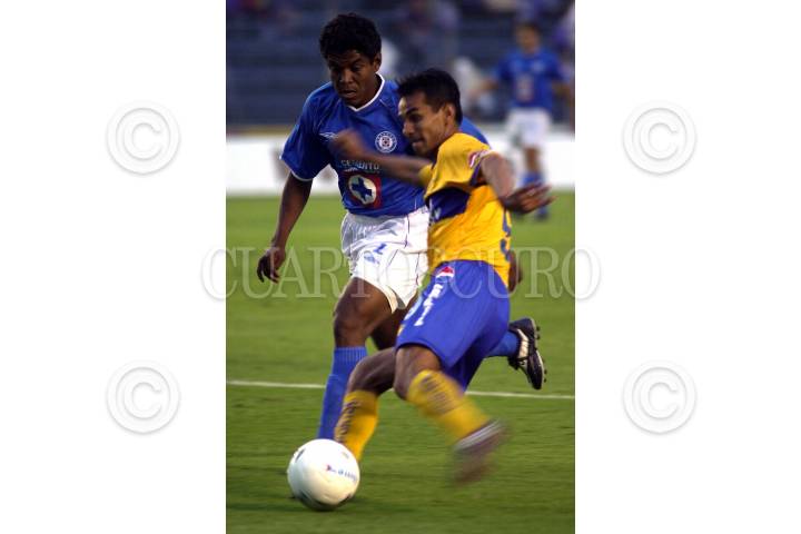 Jesús Olalde, de los Tigres, gana el balón a Melvin Brown, de Cruz Azul, durante el debut que la "máquina" realizó en casa frente a los "felinos" de Monterrey. Tigres Derrotó 3-1 a Cruz Azul logrando la segunda victoria consecutiva en el arranque del Torneo Clausura 2003. FOTO: Juan Pablo Zamora/CUARTOSCURO.COM