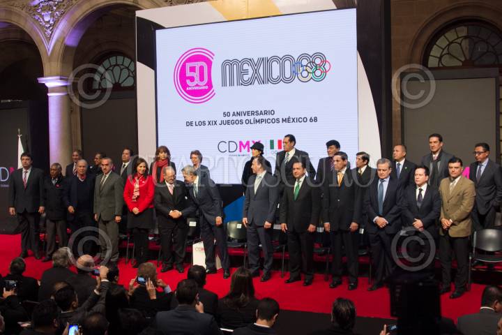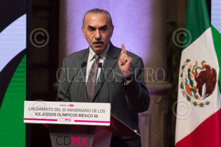 CIUDAD DE MÉXICO, 29ENERO2018.- Miguel Ángel Mancera, jefe de gobierno de la Ciudad de México, junto con Olegario Vázquez Raña, miembro honorario del Comité Olímpico Internacional, así como ex deportistas olímpicos, presidieron el anuncio de actividades para conmemorar el 50 aniversario de los Juegos Olímpicos de México 68. FOTO: GALO CAÑAS /CUARTOSCURO.COM