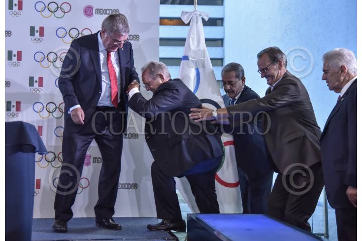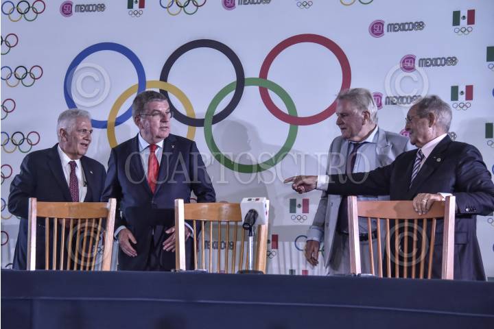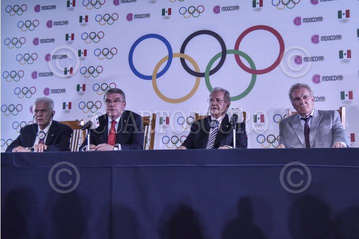 CIUDAD DE MÉXICO, 27SEPTIEMBRE2018.- Jesús Padilla, presidente del Comité Olimpico Mexicano (COM); Tomas Bach presidente del Comité Olimpico Internacional (COI); Olegario Vázquez Raña miembro honorario del Comité Olímpico Internacional durante la conferencia de prensa para ofrecer detalles después de la jornada realizada este día en conmemoración del 50 aniversario de las olimpiadas en Mexico. FOTO: MARIO JASSO /CUARTOSCURO.COM